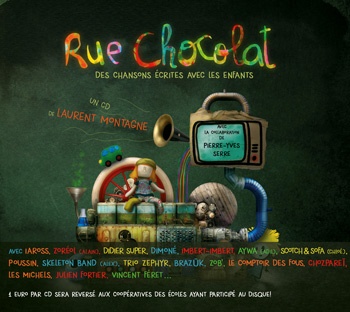 "Rue Chocolat", c'est une aventure un peu folle, comme le sont parfois les rêves d’enfants. Un album avec des chansons écrites pour et par les enfants. 250 élèves de 5 écoles rejoints par une 30aine d’artistes de Montpellier et de sa région. Une fabuleuse épopée humaine et artistique née des ateliers de création que Laurent Montagne réalise dans les écoles depuis plusieurs années avec son comparse Pierre-Yves Serre.